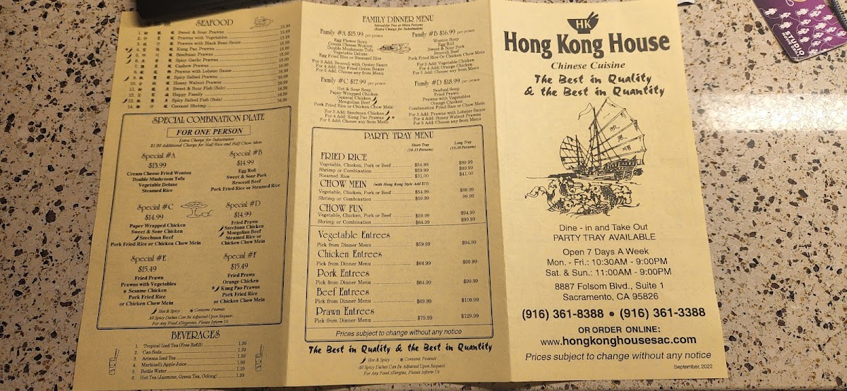 Welcome to Hong Kong House, a gem nestled in Sacramento, CA, where authentic Chinese flavors come to life. The menu spans a delightful array of seafood and other entrees, featuring highlights such as Sweet & Sour Prawns, Kung Pao Prawns, and the ever-popular Honey Walnut Prawns. Each dish is crafted with generous portions and affordable pricing, making it an irresistible choice for food lovers.